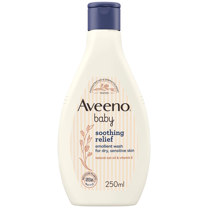Formed with ultra-gentle, clean ingredients, the Aveeno Baby Soothing Relief Emollient Wash is an unscented cleanser designed with delicate skin in mind. n Infused with pure, high-quality oat oil and vitamin E, the soap-free baby wash utilises premium ingr