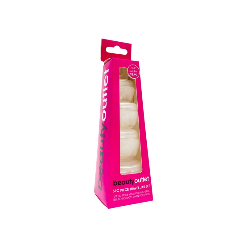 The Beauty Outlet 5PC Travel Jar Set gives you 5 TSA-approved containers for your favourite lotions, gels, and creams, perfect for short-term travels. Fill it up on the go and when you arrive, your skincare essentials will be waiting for you - without the