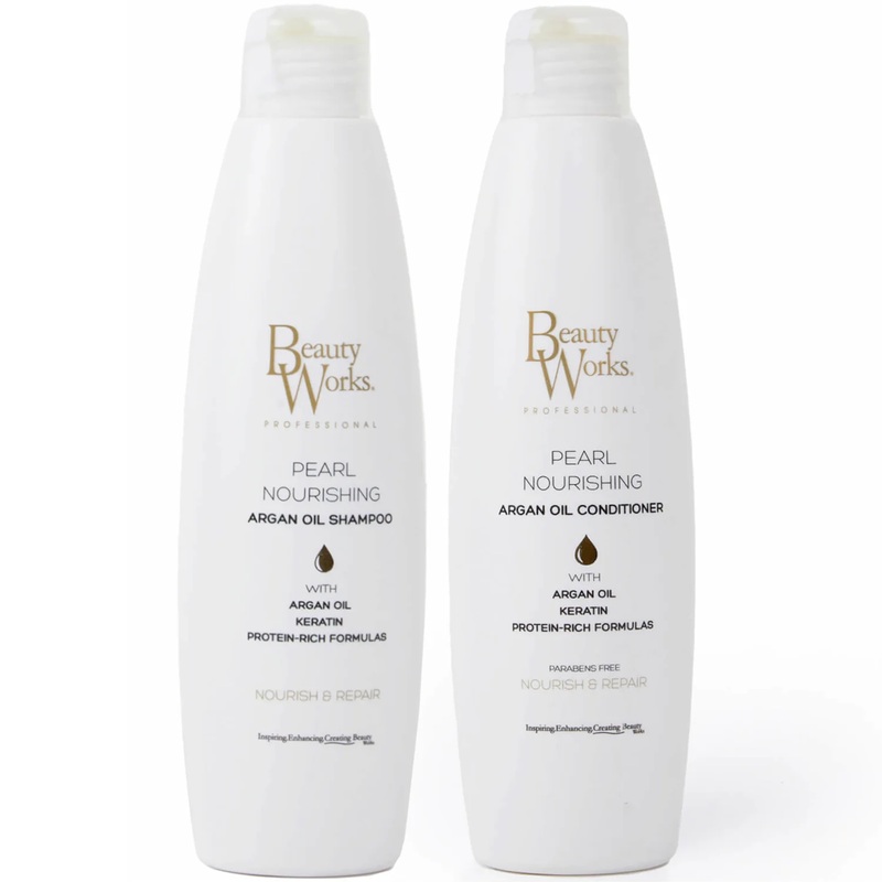 Designed with hair extensions in mind, the Pearl Nourishing Shampoo and Conditioner Bundle from Beauty Works seeks to fortify and hydrate your lengths. Enriched with Argan oil and milk protein, the bundle supports your extensions by nurturing each strand for softer and smoother-looking hair. n Set Contents: n Pearl Nourishing Shampoo 250ml n A hydrating shampoo designed to help prolong your hair extensions longevity by nurturing your lengths and creating a lustrous-looking shine. Enriched with antioxidants and fatty acids, the shampoo helps minimise the risk of breakage by sealing-in moisture. n Pearl Nourishing Conditioner 250ml n Infused with keratin, the conditioner seeks to strengthen hair to create the look of softer and smoother tresses, while promoting an effortless detangling process.